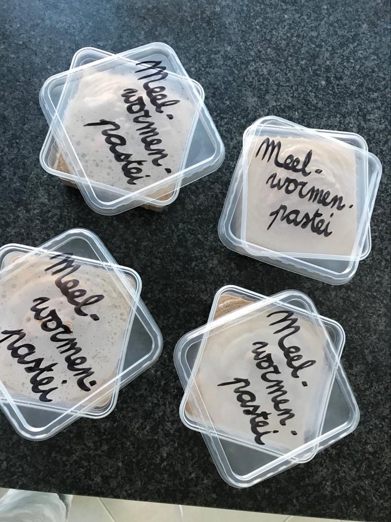 Eens geoogst zullen de leerlingen zich afvragen wat er nu dient te gebeuren. Hierbij wensen we niet al te lang stil te staan bij het gegeven dat de meelwormen gedood moeten worden. Misschien is het moeilijk om hier zinnige input van de leerlingen te krijgen. Misschien kunnen de afgewerkte producten getoond worden en kunnen ze brainstormen over hoe daartoe te komen. In de praktijk worden de meelwormen geblancheerd (zoals boontjes). Nadien kunnen ze ofwel gedroogd worden (in een oven bij 60 of 90 °C) en daarna vermalen tot een meel of rechtstreeks de blender in om tot een pasta te komen. Een voordeel van het drogen is dat het product meer dan een jaar bij kamertemperatuur kan worden bewaard. Bij 60 °C duurt het veel langer dan bij 90 °C maar hoe hoger de temperatuur, hoe slechter de kwaliteit (de leerlingen kunnen een kleurverschil waarnemen). Het voordeel van pasta is dat er niet moet worden gedroogd (energie en tijd besparend). Het product is echter beperkt houdbaar (1 dag bij kamertemp, 3 dagen in de koelkast maar wel meer dan een jaar in de diepvries). De leerlingen kunnen zich hier verder in verdiepen. Waarom bederft een product (microben, schimmels,…)? Hoe kan je waarnemen of een product nog vers genoeg is of niet (kleur, geur, smaak maar hiermee opletten…)? Wat kunnen we doen om een product langer te bewaren (goed afsluiten, in de kelder, koelkast of uiteindelijk diepvries plaatsen,…)