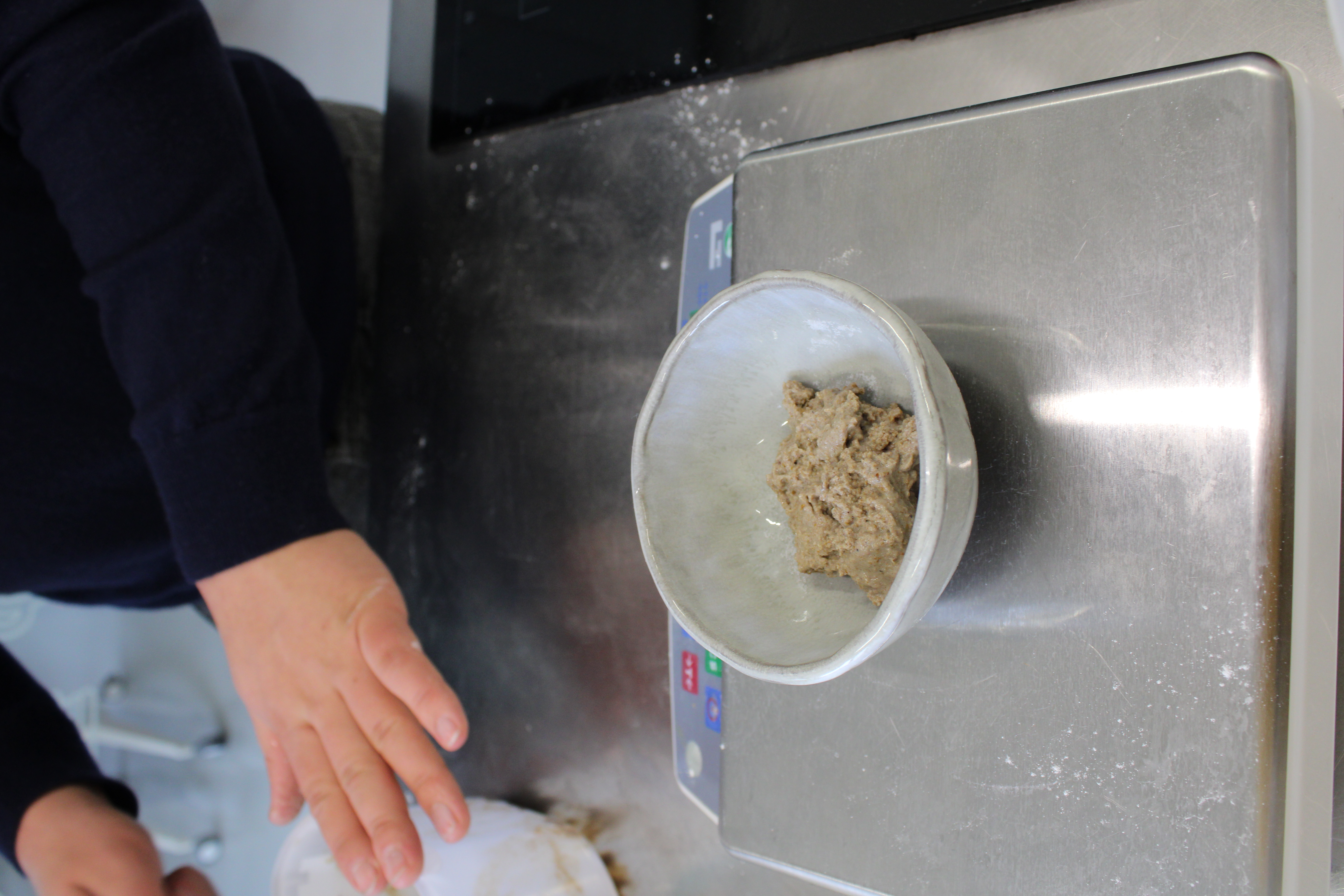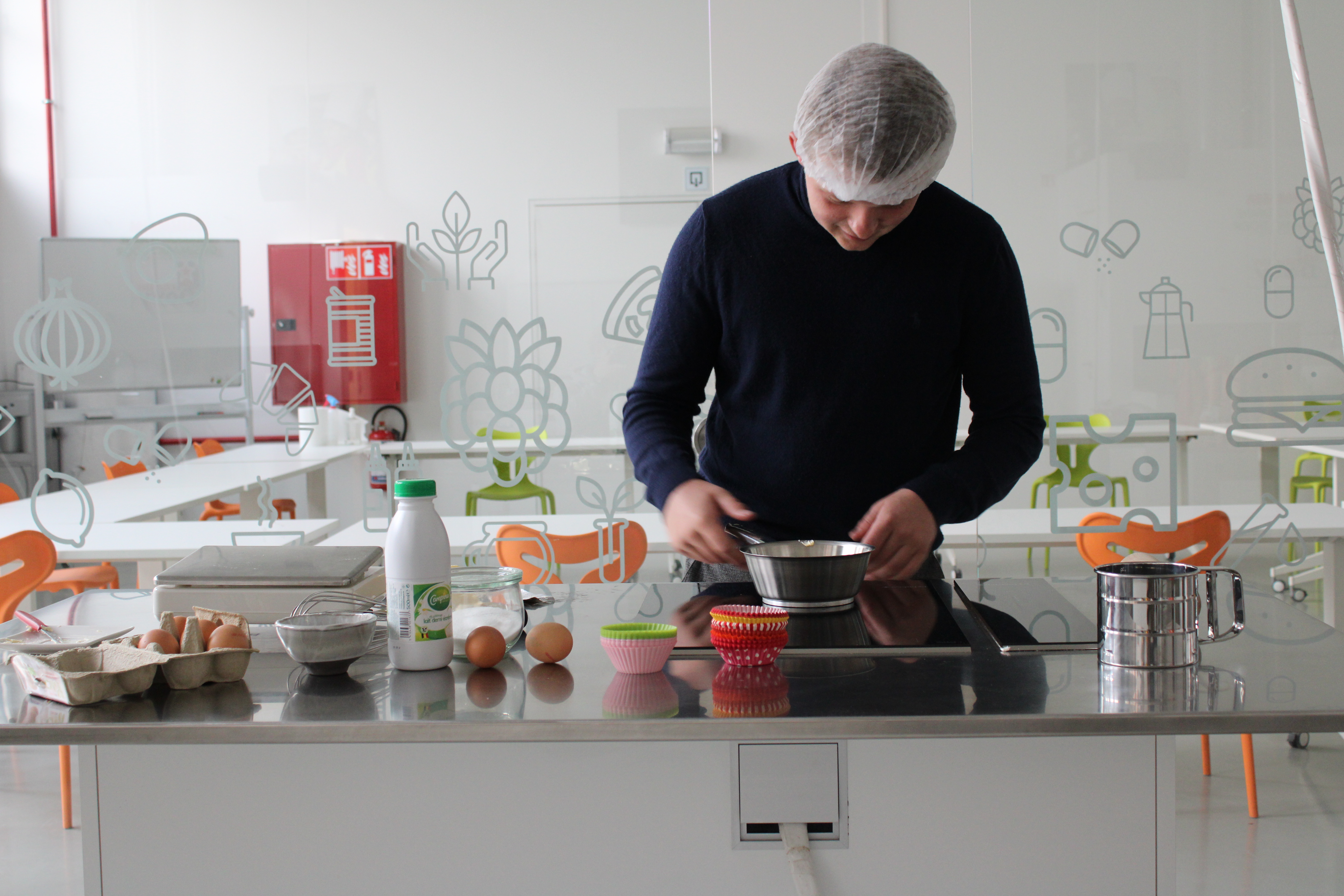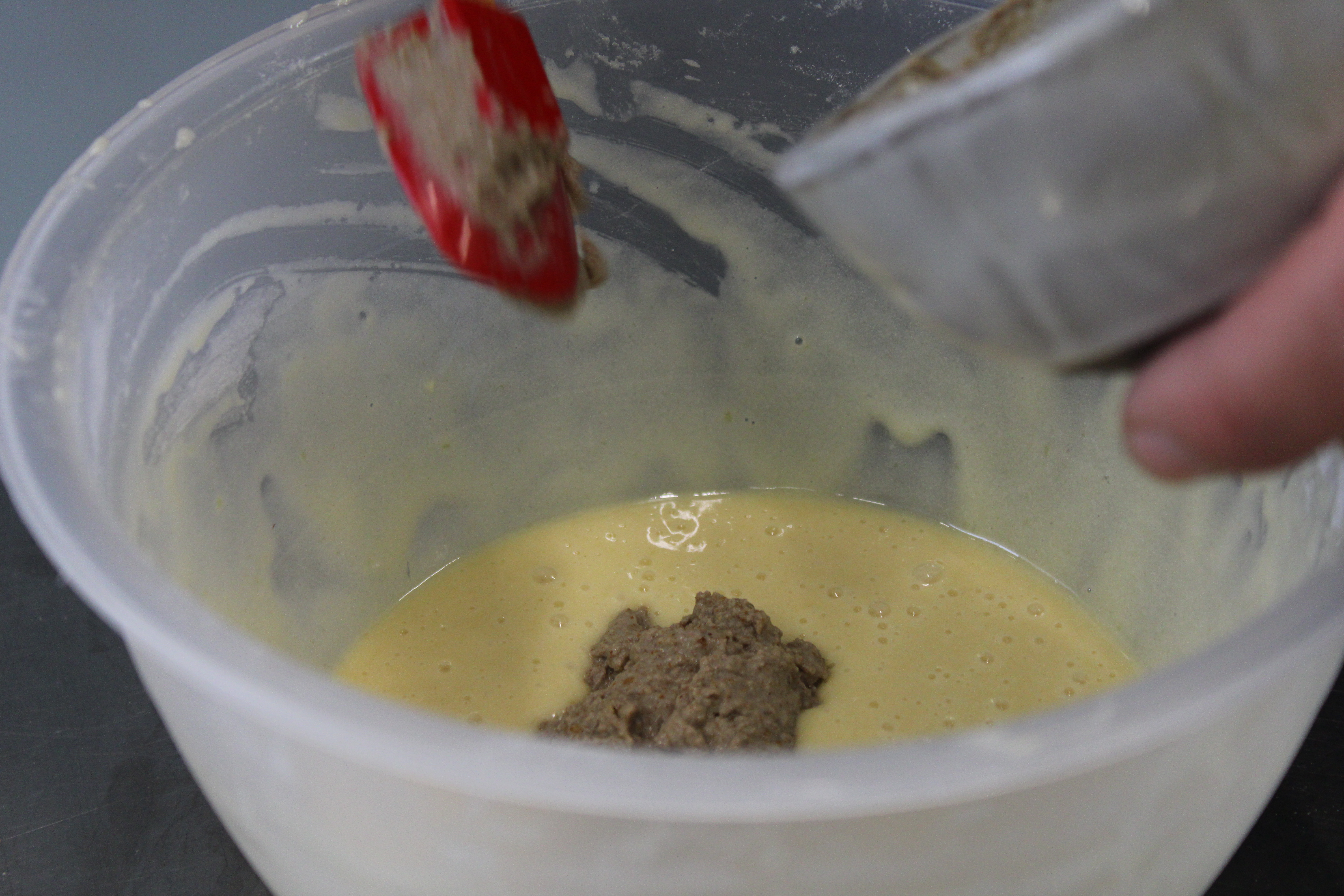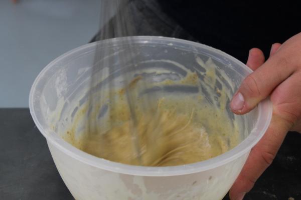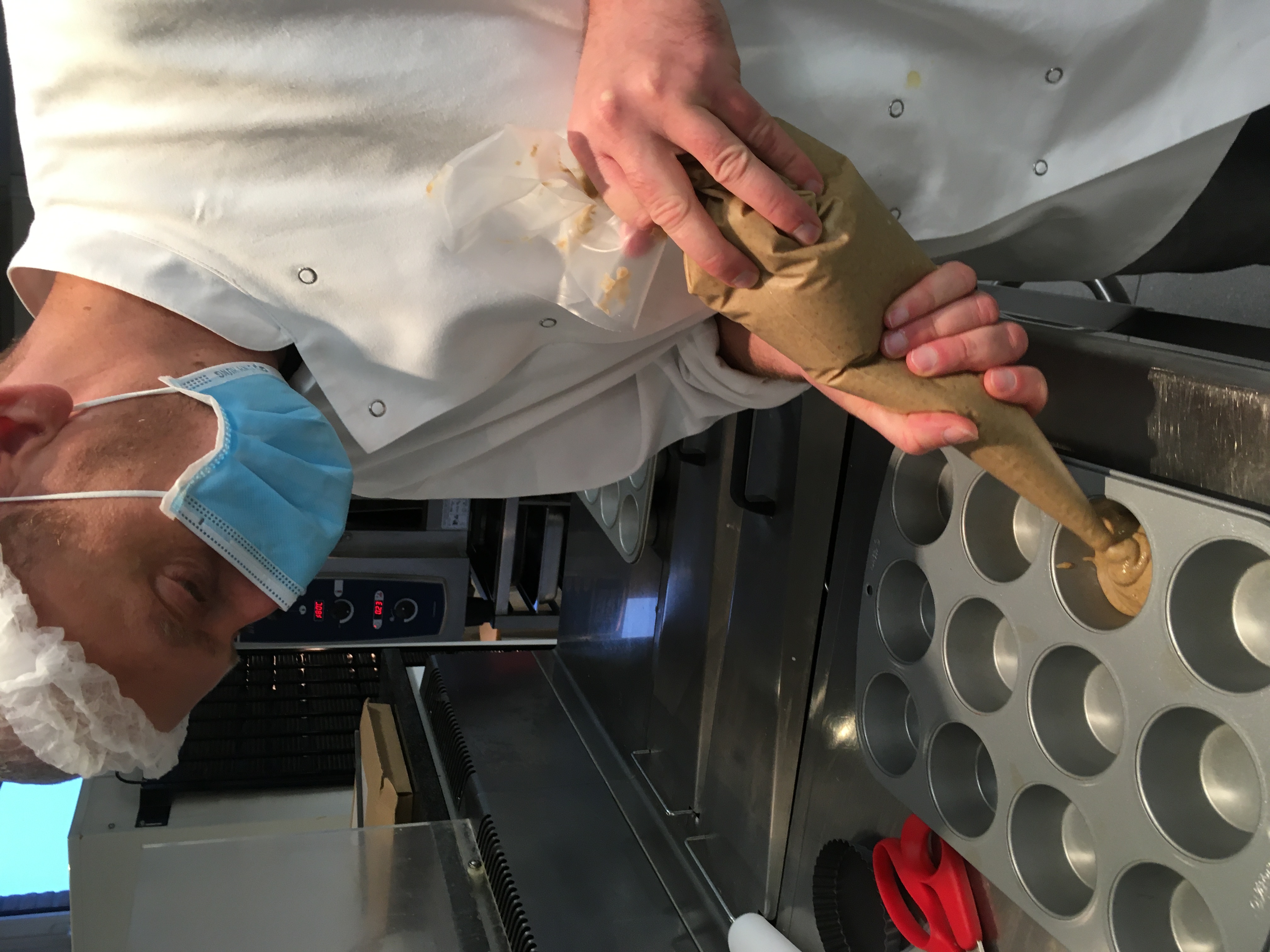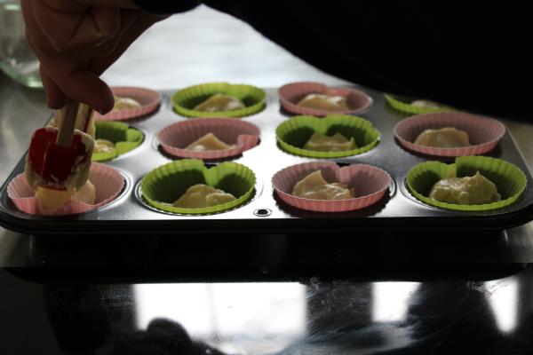 Per groepje van 2 bakken ze 5 cakes. De eerste cake is al ingevuld. Het is een cake met gelijk verdeelde ingrediënten (‘quatre-quart’) en is bedoeld als oefening om met het materiaal te werken en tegelijk de traditionele cake zonder insecten.