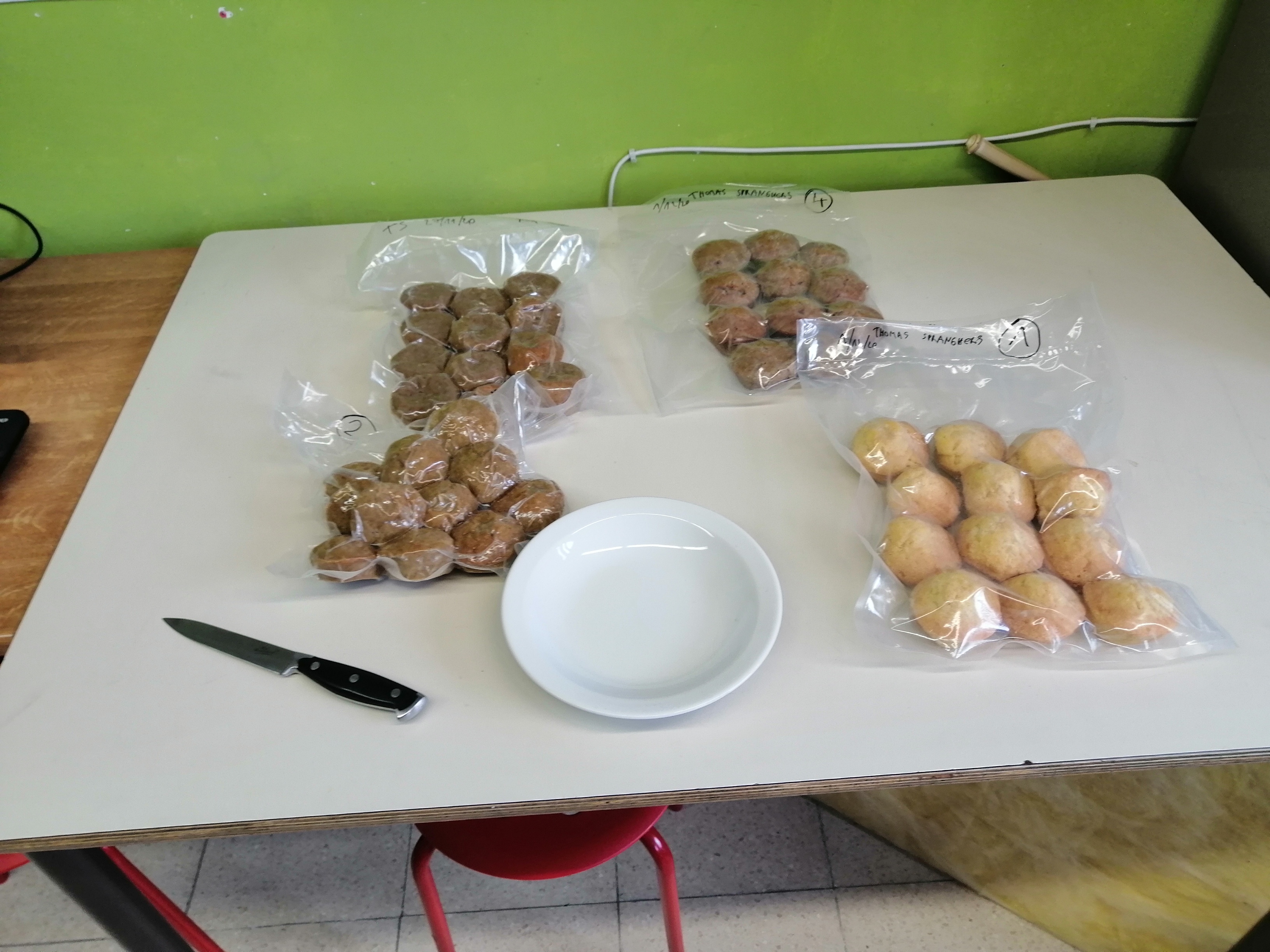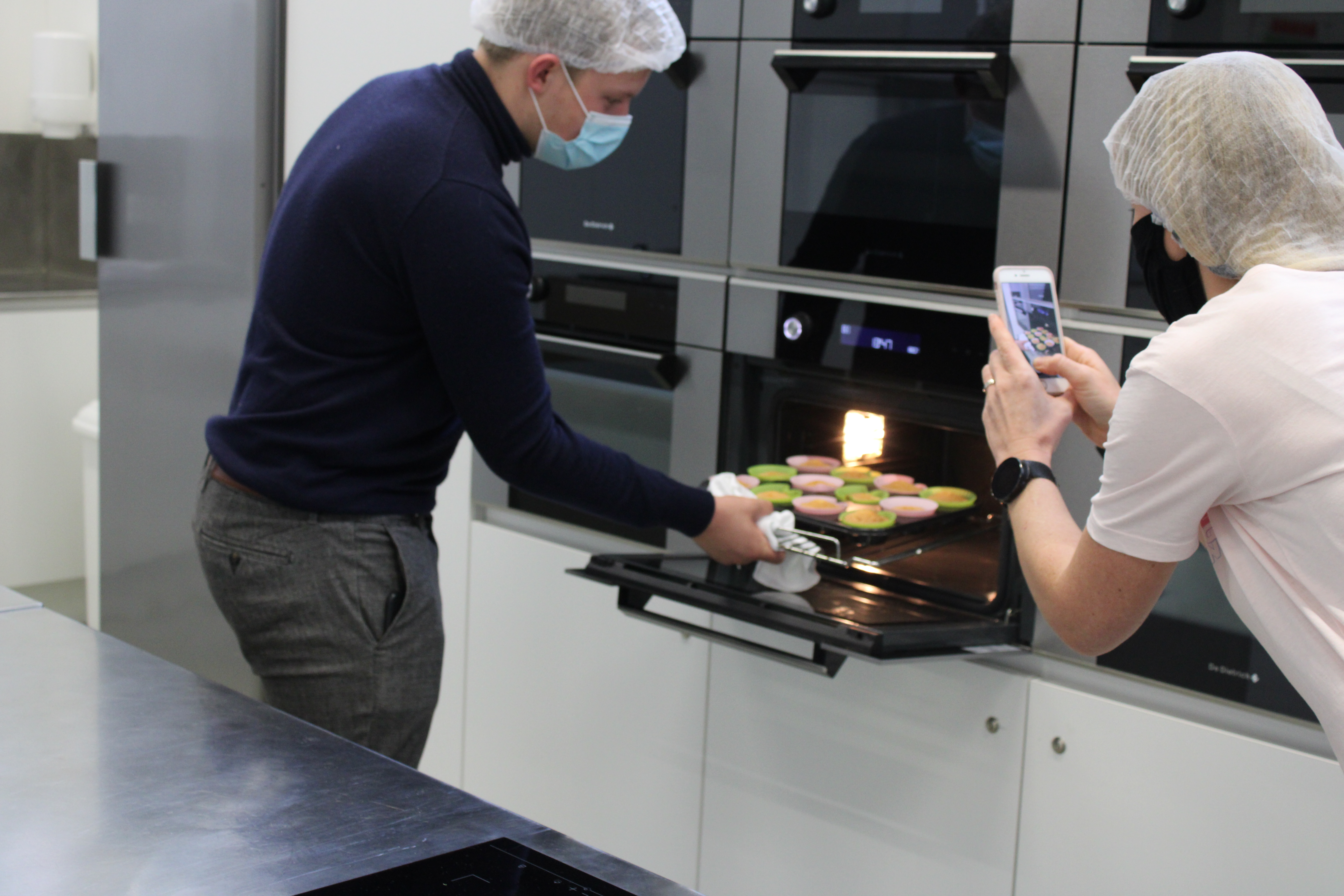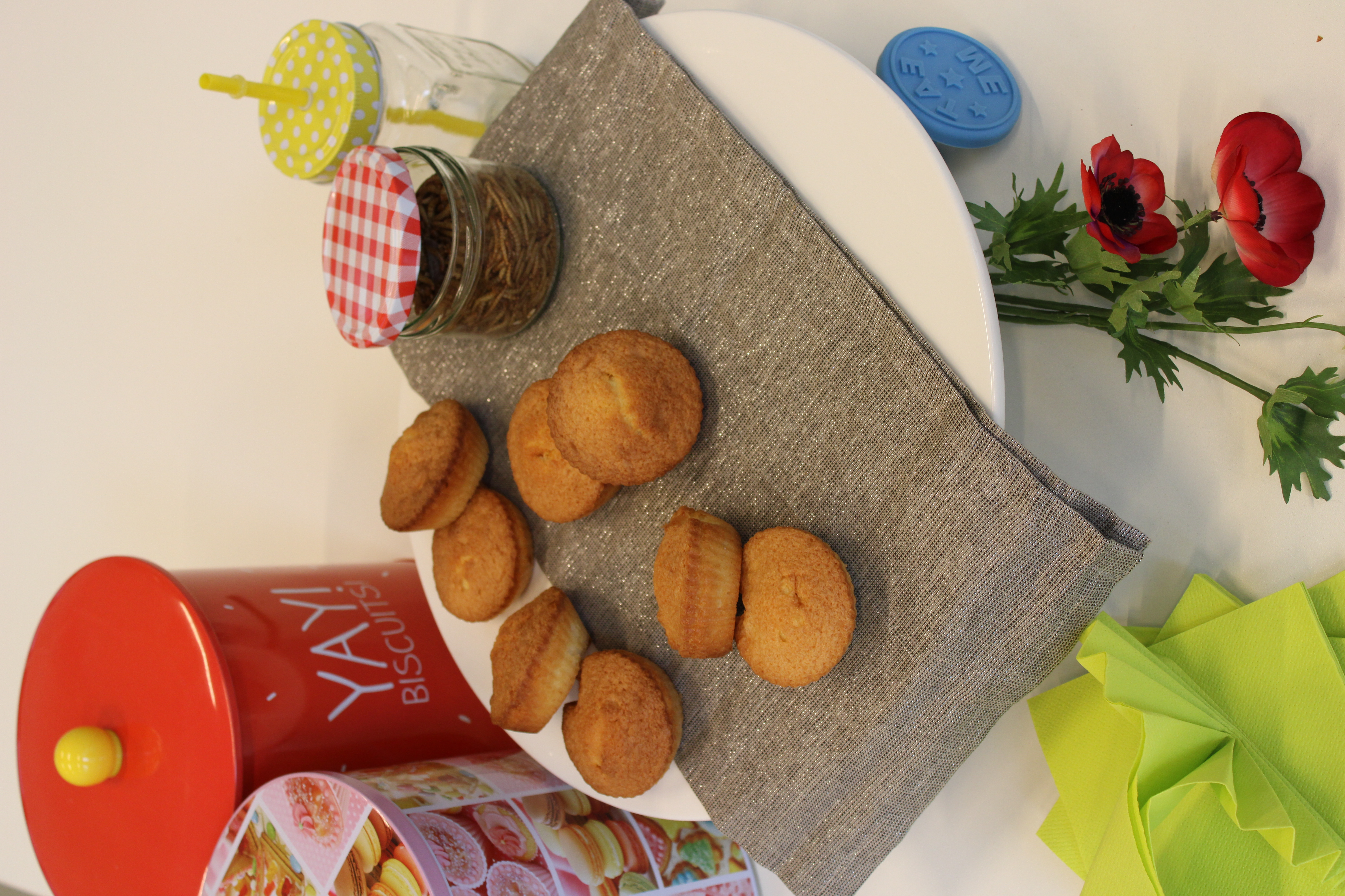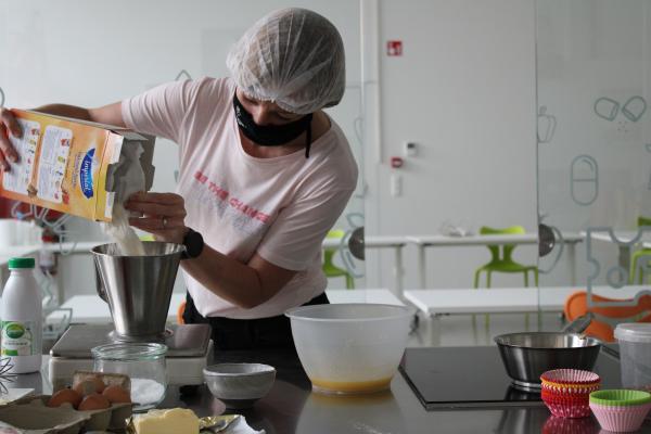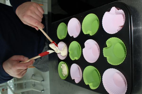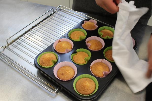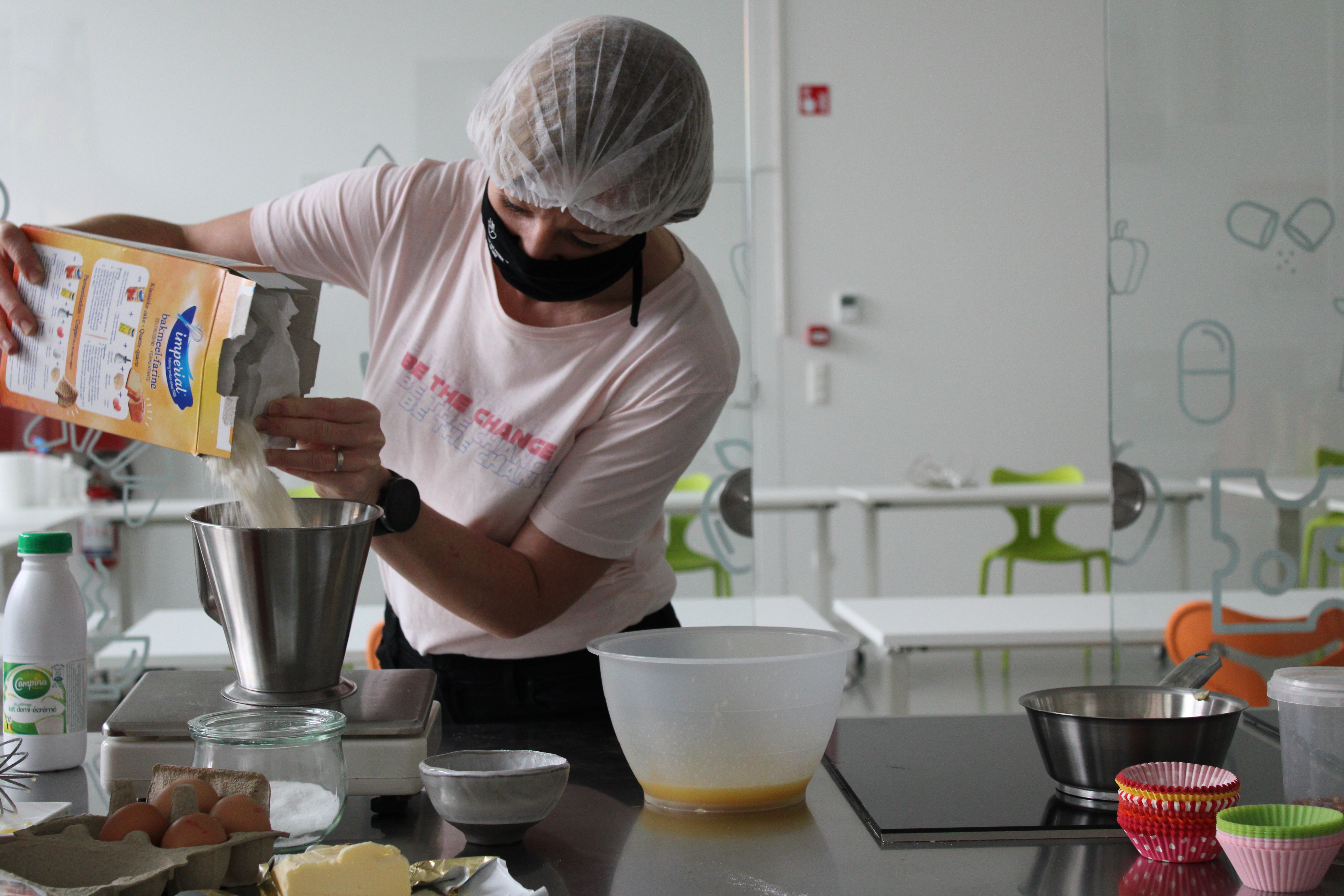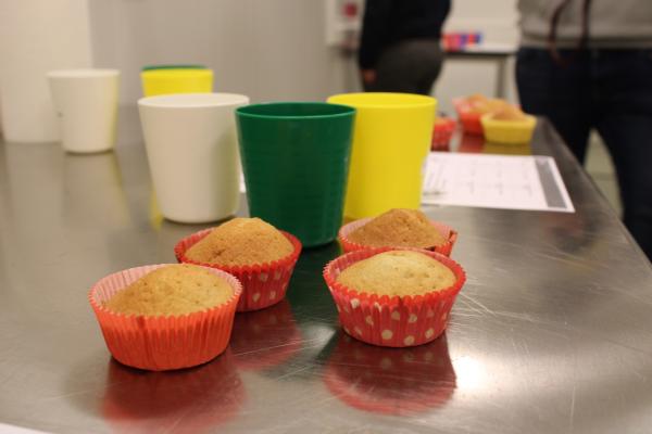 In het Huis van de Voeding (HvdV) worden per groepje 5 cakejes gebakken. Eentje zonder insectenmeel, de andere 4 met wisselende hoeveelheden.