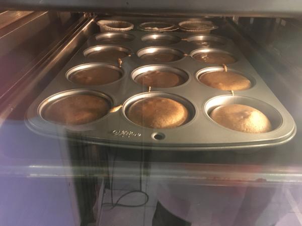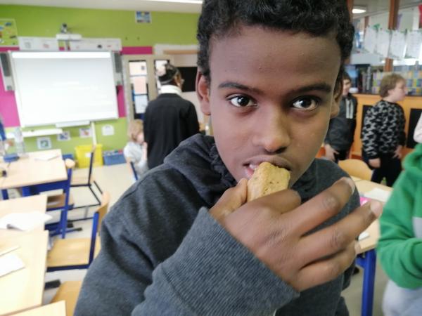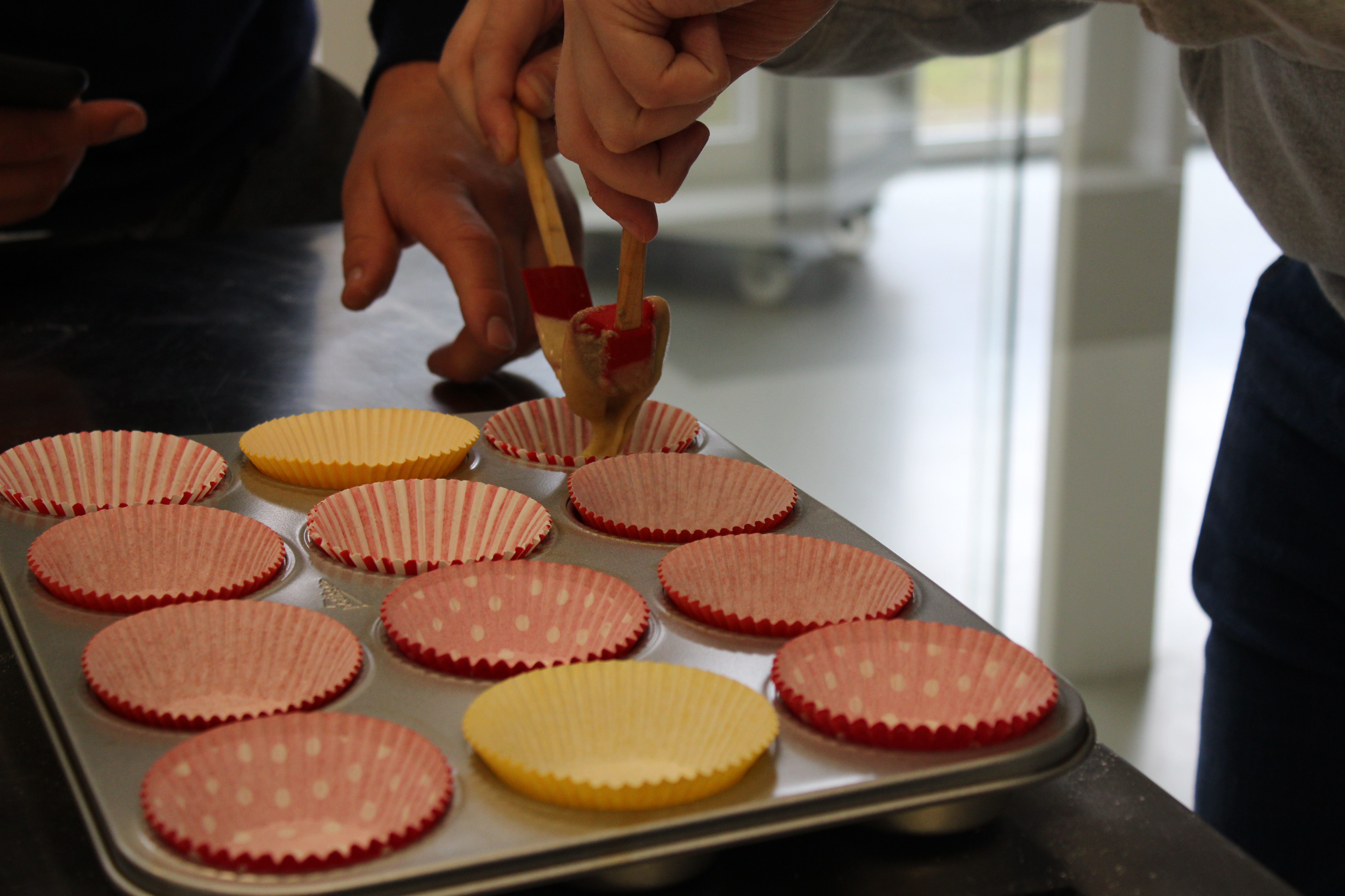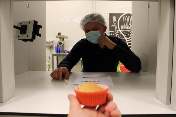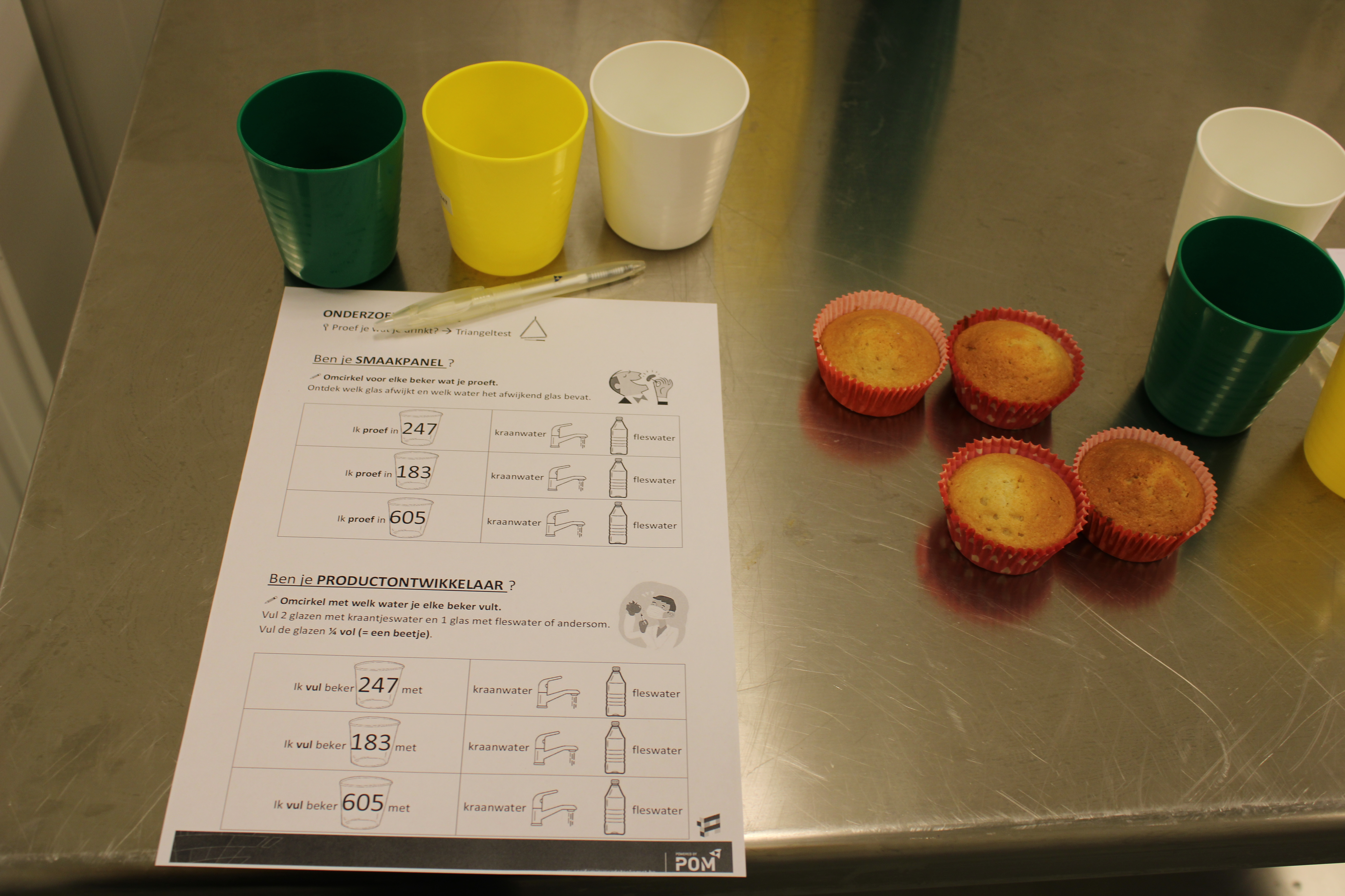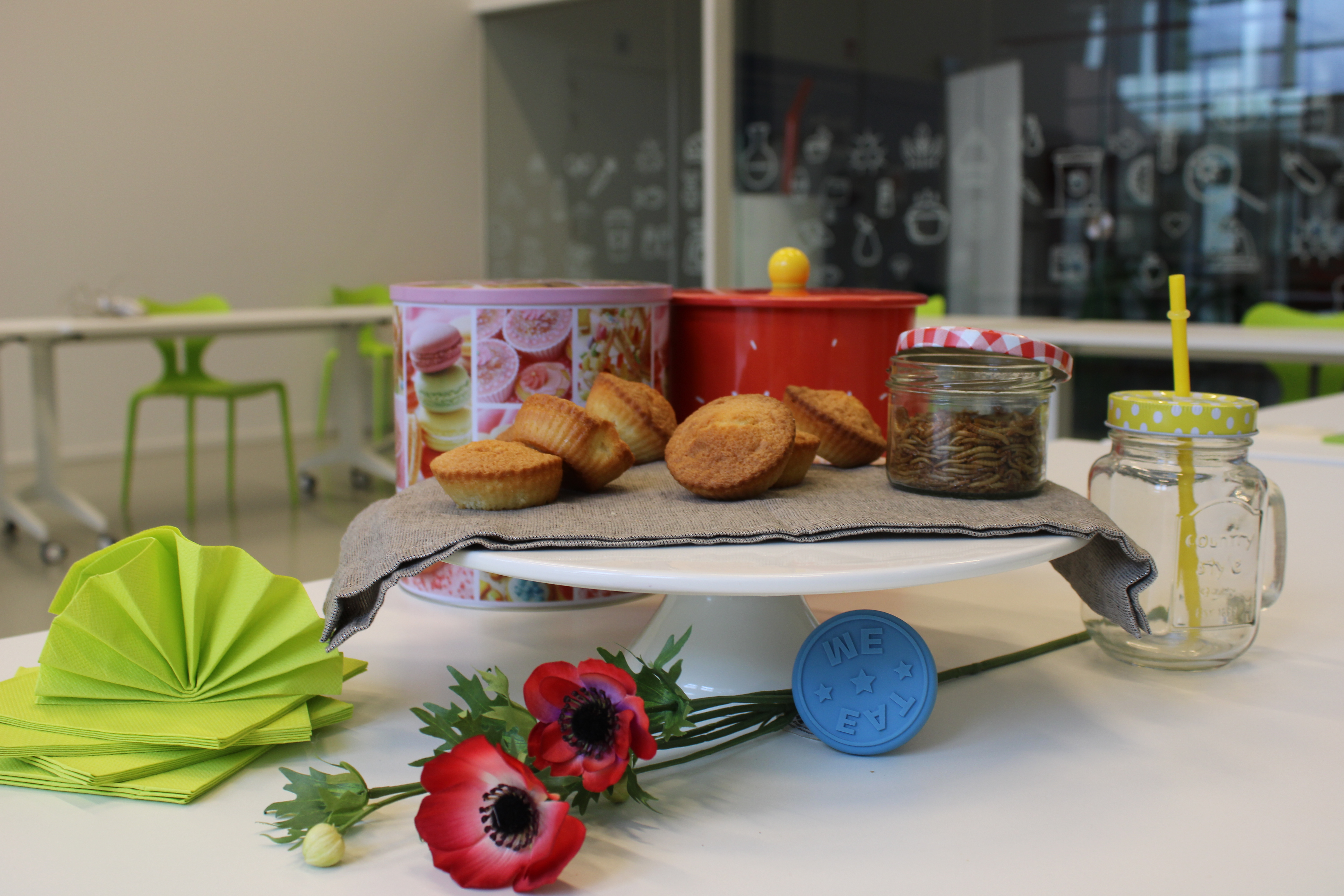 In het Huis van de Voeding (HvdV) worden per groepje 5 cakejes gebakken. Eentje zonder insectenmeel, de andere 4 met wisselende hoeveelheden.