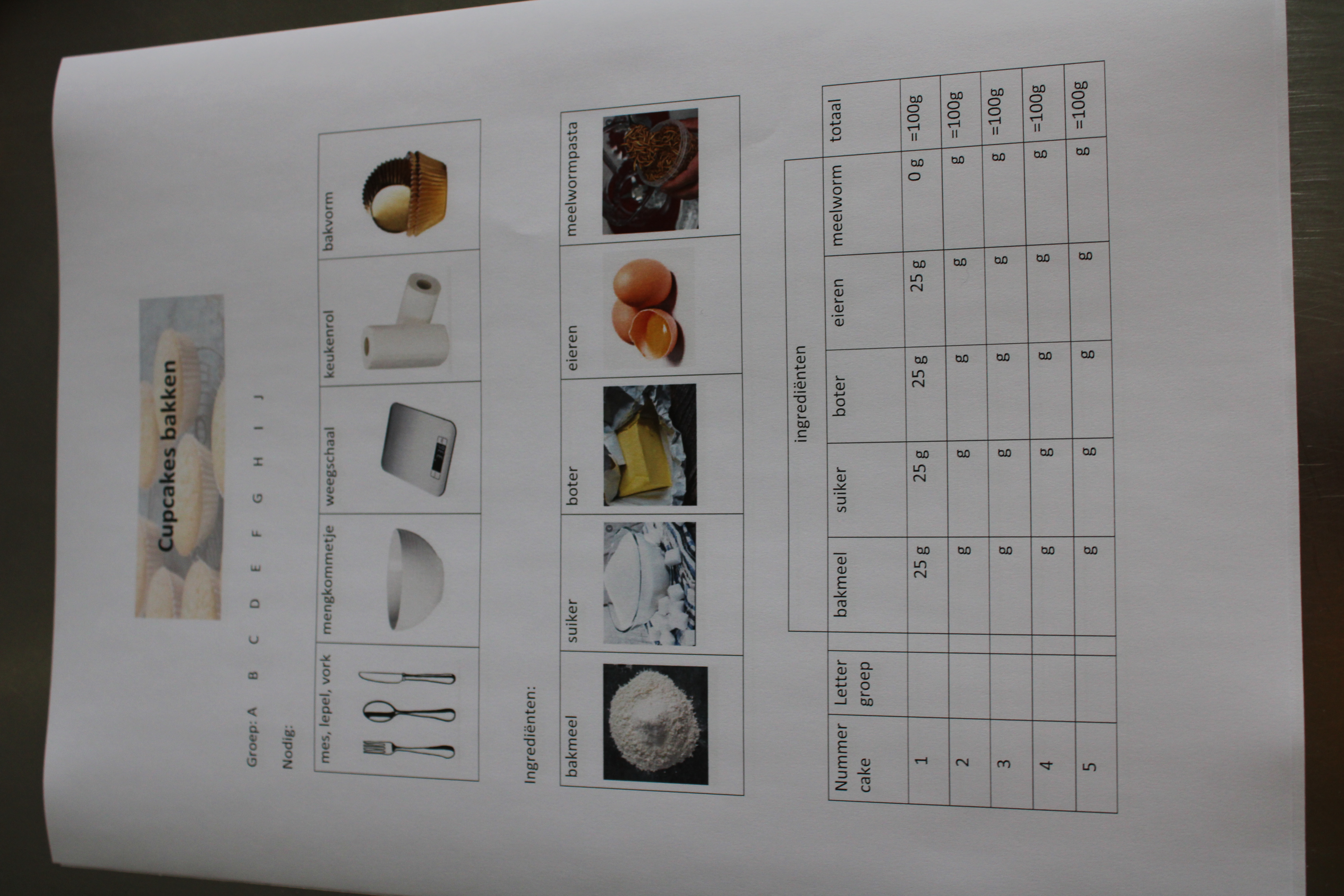 Het totaal van elke cake moet 100g zijn, maar er mogen ingrediënten in andere verhoudingen in. Voorbeeld: 30g boter, 10g insectenpasta, 20g meel, 20g suiker, 20g ei.