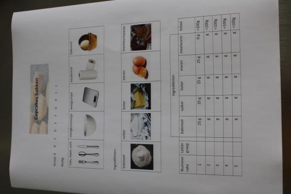 Per 2 kinderen mes, lepel, vork, 2 mengkommetjes, cupcakevormpje (op onderzijde 1A, 2A, 3A, 4A, 5A voor de A-groep, idem voor B…-, C…- groep (afhankelijk van hoeveel groepjes er zijn)