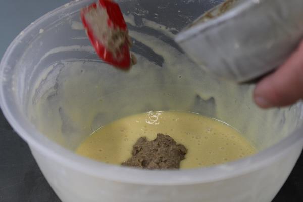 Daarna worden de insecten erbij gehaald. Hoeveel insectenpasta gebruiken we? Voegen we het gewoon toe? Of vervangen we iets en hoeveel?